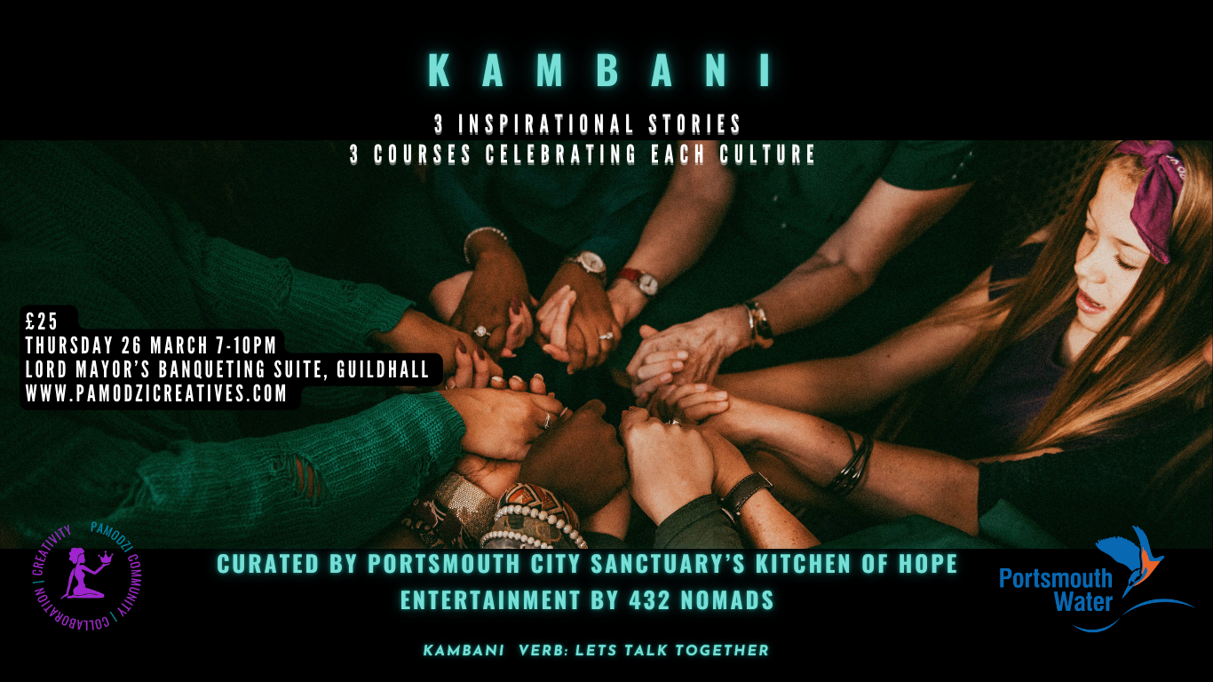 Join us for Kambani – an evening of shared food, storytelling, and cultural celebration. This special community event will bring together stories of three individuals with lived experience of migration. Portsmouth City of Sanctuary and The Kitchen of Hope will curate a three course meal that celebrates each storyteller’s culture.